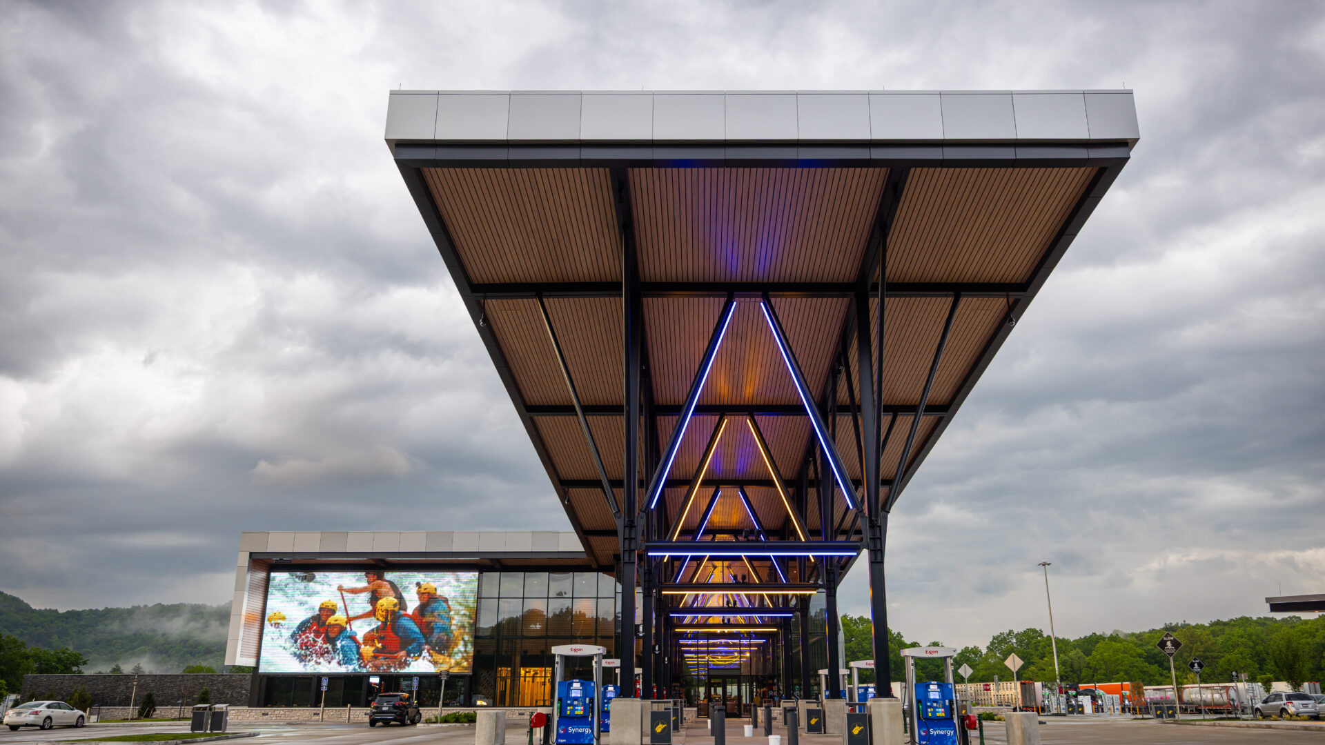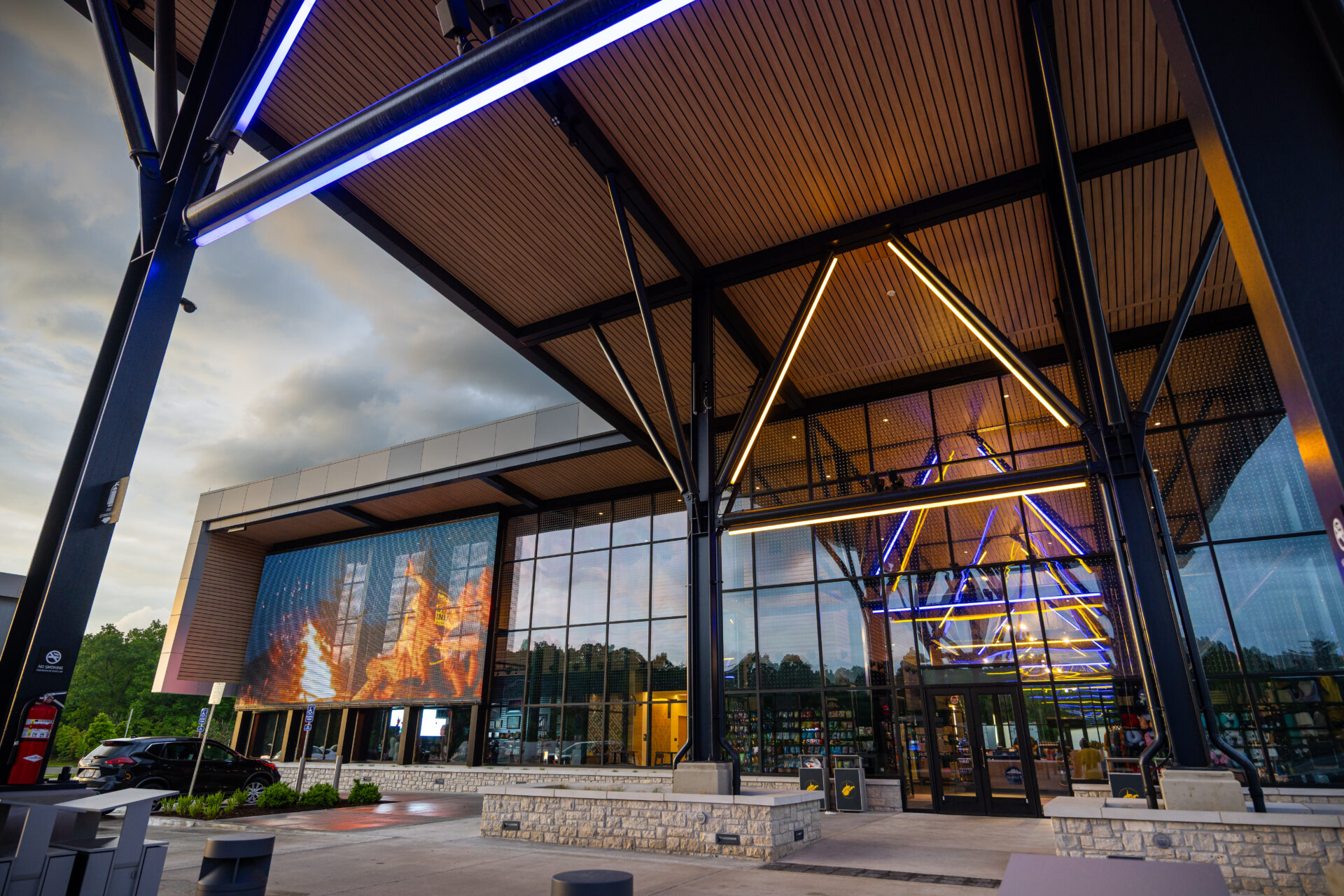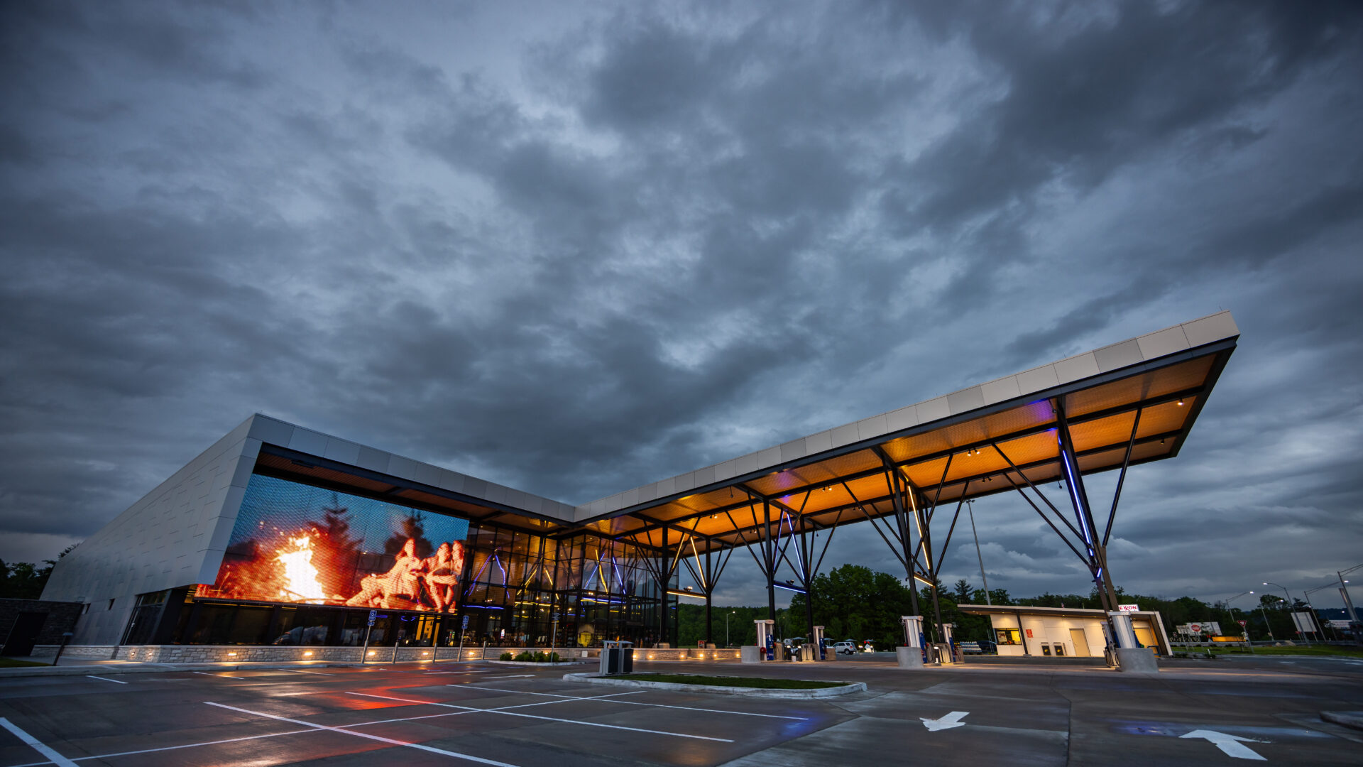 Directly facing the busy I-77 corridor, the Bluestone Travel Plaza display delivers high-impact visual messaging to thousands of passing drivers each day. Developed in partnership with GKD-USA, Inc., the LED Mediamesh™ screen was designed to boost regional tourism while providing plaza-related information.